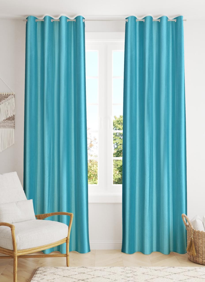 This Aqua blue color curtain, made of solid fabric with a smooth texture, adds a lively touch to any room. Hung using silver grommets, it ensures easy sliding and a modern look. Available in 4ft width with two length options of 7ft and 9ft, it's perfect for blocking light and enhancing privacy while providing a clean and polished appearance.
