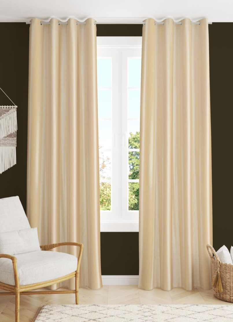 The beige curtain is light and slightly sheer, with a grommet top and metal rings for easy hanging. It is floor-length, adding elegance and a touch of softness to the room.