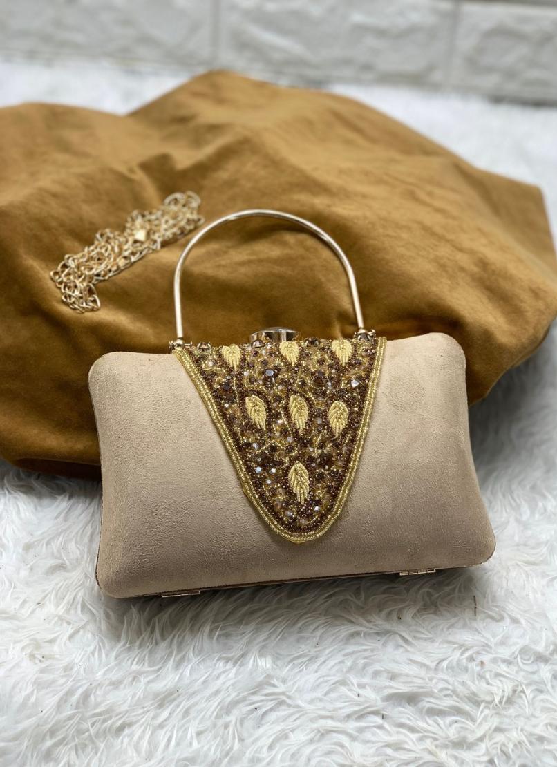 This exquisite Zari Handwork Clutch Sling combines luxurious velvet with intricate handcrafted designs, making it a perfect accessory for women and girls. Featuring an 8x5-inch compact size, it has one main compartment and an inside pocket for essentials. The secure clasp closure and versatile wrist handle with a long chain strap add practicality and elegance, making it ideal for parties or traditional occasions.