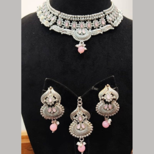 A stunning jewelry set with intricate silver designs and blue accents, including a necklace and matching earrings.