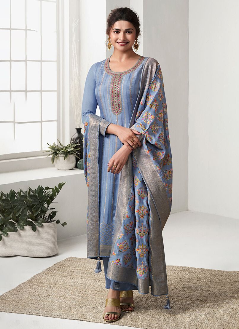 This elegant outfit features a muslin top adorned with intricate embroidery, jacquard patterns, and zari work, exuding sophistication. The soothing blue tone is complemented by colorful floral designs, adding vibrancy to the ensemble. Paired with a soft and comfortable santoon bottom, it ensures both style and practicality. The matching dupatta, enriched with jacquard and zari detailing, completes the graceful look. Perfect for festive occasions or formal gatherings, this attire combines traditional charm with modern elegance, making it a versatile and stylish choice.