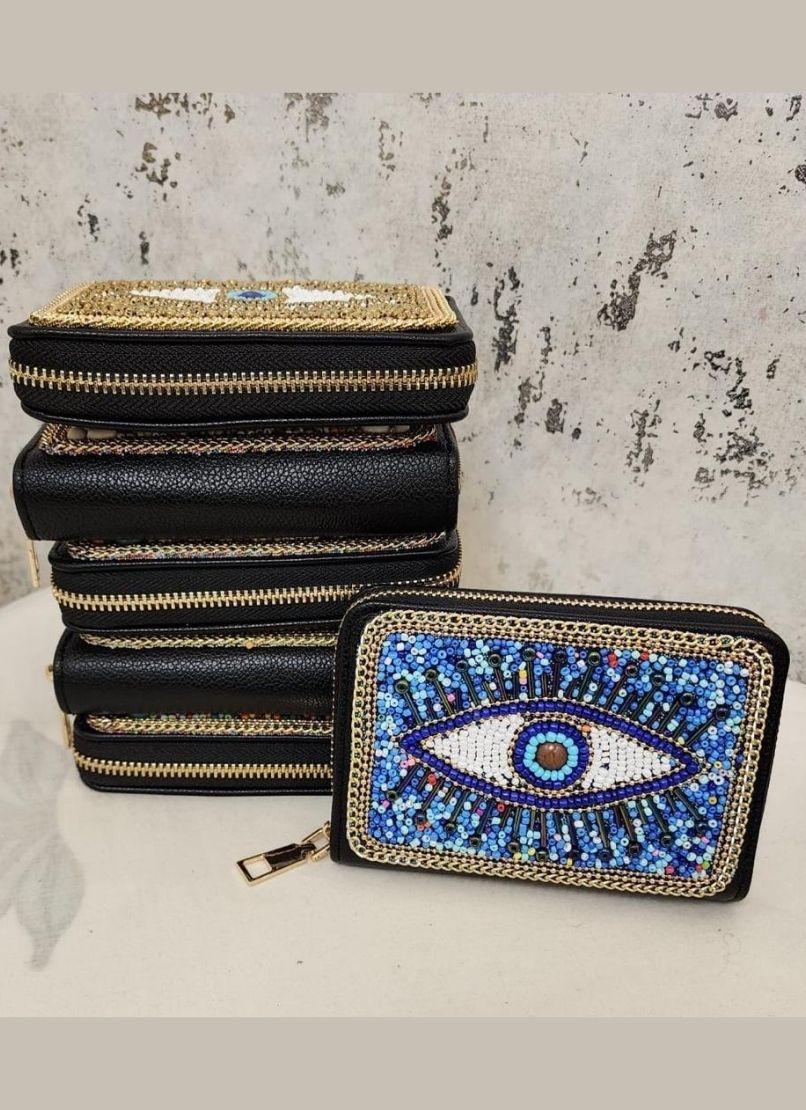 This compact wallet, measuring 5 inches by 4 inches, features a black base with intricate beaded work in blue, white, black, and gold hues, forming an eye pattern. It includes a secure gold zip closure and functional compartments for cash, cards, and coins. Combining premium craftsmanship and durability, it ensures both practicality and style for everyday use.