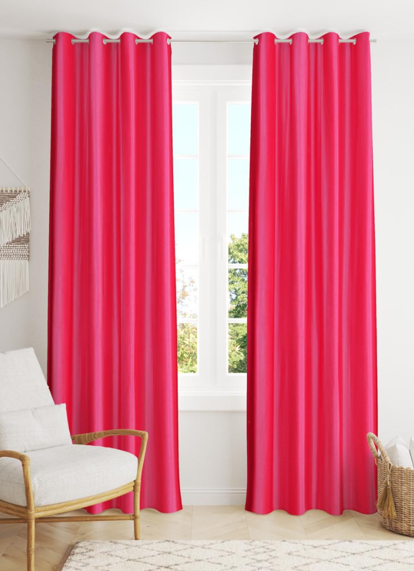 It's a bright pink, floor-length, thick, opaque fabric curtain hung on a white rod with silver grommets. The top is pleated, creating a wavy pattern.