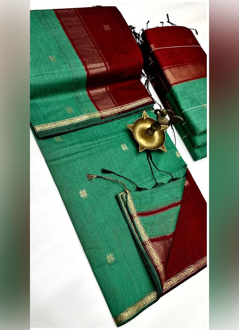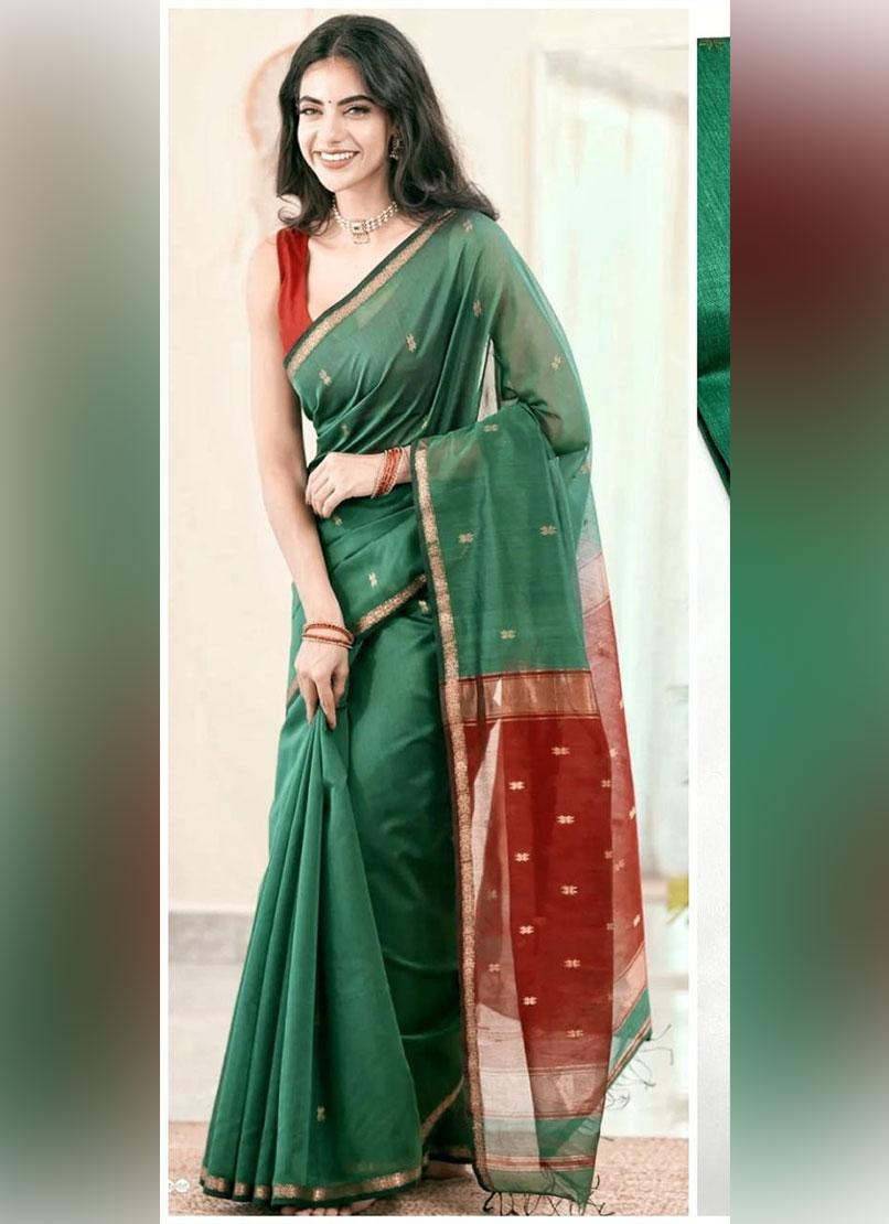 This Silk Cotton Saree features a premium fabric with a soft, lightweight texture. Its sleek border work on both sides adds refinement, while the contrast pallu and blouse enhance visual appeal. Delicate woven motifs across the saree further elevate its artistic elegance.