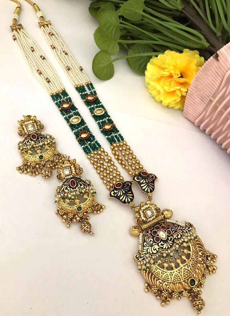 This gold long necklace features multiple layers of gold chains adorned with red, green, and white gemstones. A striking pendant enhances its regal appeal, while matching earrings complete the refined bridal jewelry set, perfect for traditional occasions.