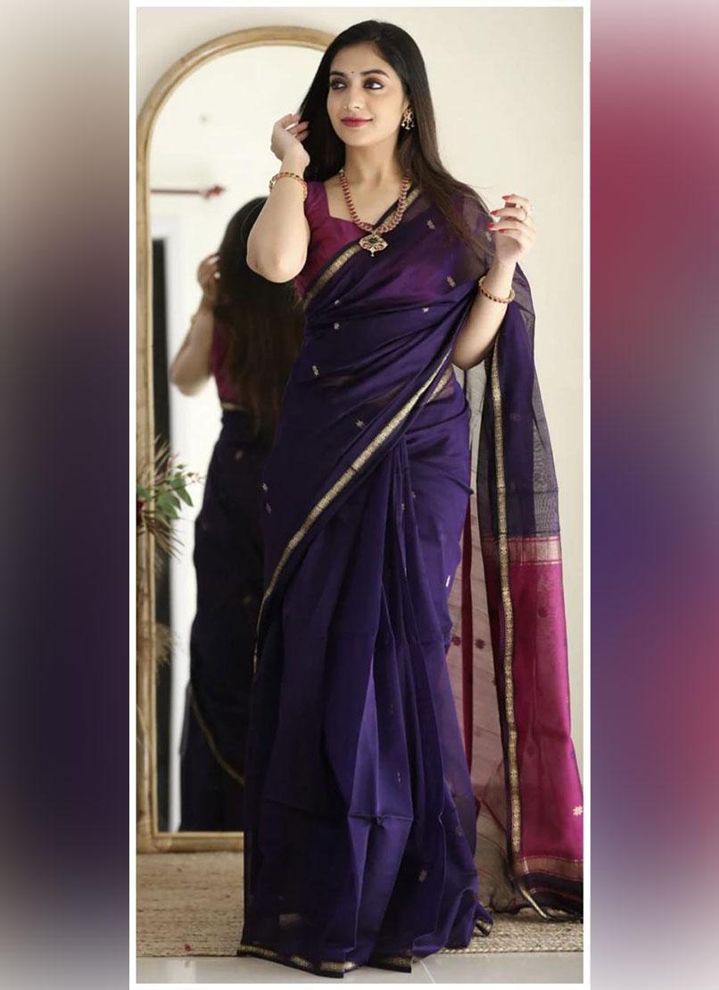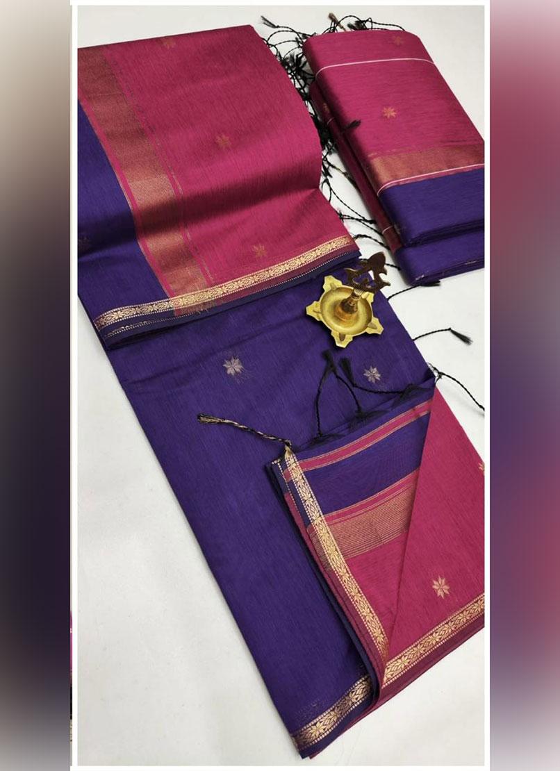 This Dark Purple Silk Cotton Saree features a premium lightweight fabric with a sleek pink border enhanced by golden accents. The contrast pink pallu and blouse add to its graceful charm, while delicate golden motifs complete its refined appeal. A perfect combination of tradition and modern elegance.