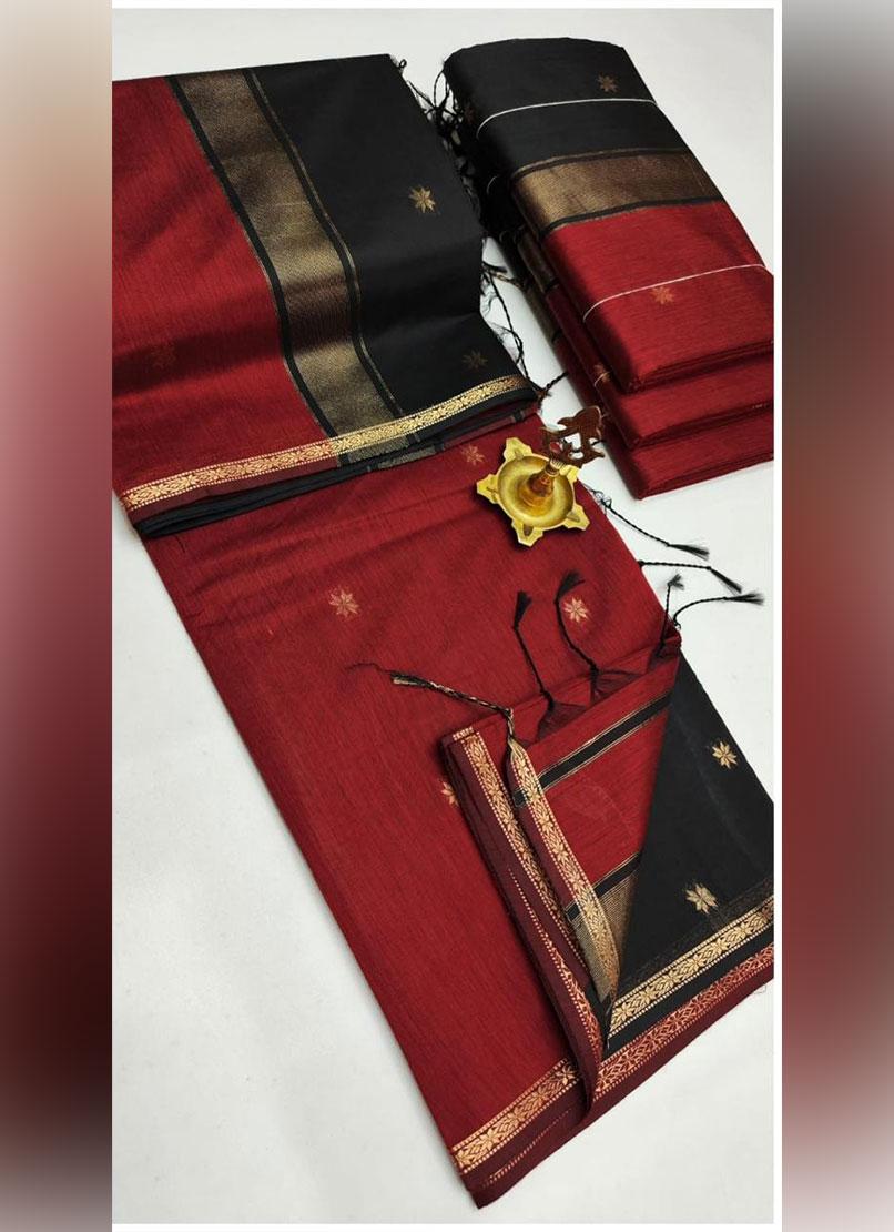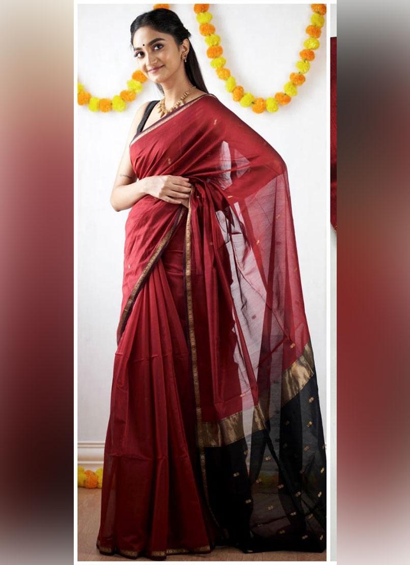 This Dark Red Silk Cotton Saree features luxurious lightweight fabric with sleek golden border work on both sides. The contrast pink pallu and blouse elevate its elegance, while small woven golden motifs add delicate charm. A timeless piece blending tradition with modern appeal.