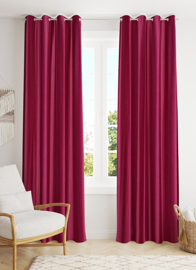 Deep red curtains, 4 feet wide, available in 7 feet and 9 feet lengths. Minimalistic and sleek design with thick, likely light-blocking fabric. Floor-length curtains that pair well with contemporary decor. Striking when contrasted with white window frames, adding elegance and a modern touch to any room.