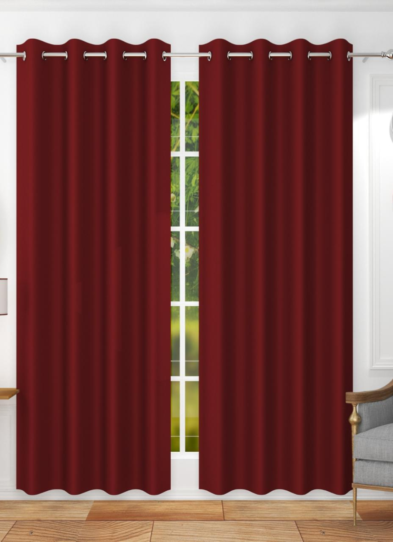 This deep, rich red curtain is made from thick, opaque fabric, likely providing excellent light-blocking capabilities. Each panel is 4 feet wide and available in lengths of 7 feet and 9 feet. The design is simple with a solid color and no patterns, and it hangs using silver grommets.
