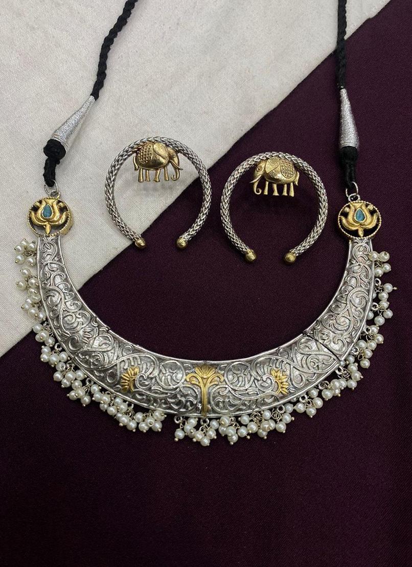 This floral silver necklace set features a gold centerpiece with intricate engravings, accompanied by matching earrings adorned with delicate pearls. Elegant craftsmanship and refined detailing make this a stunning traditional jewelry piece.