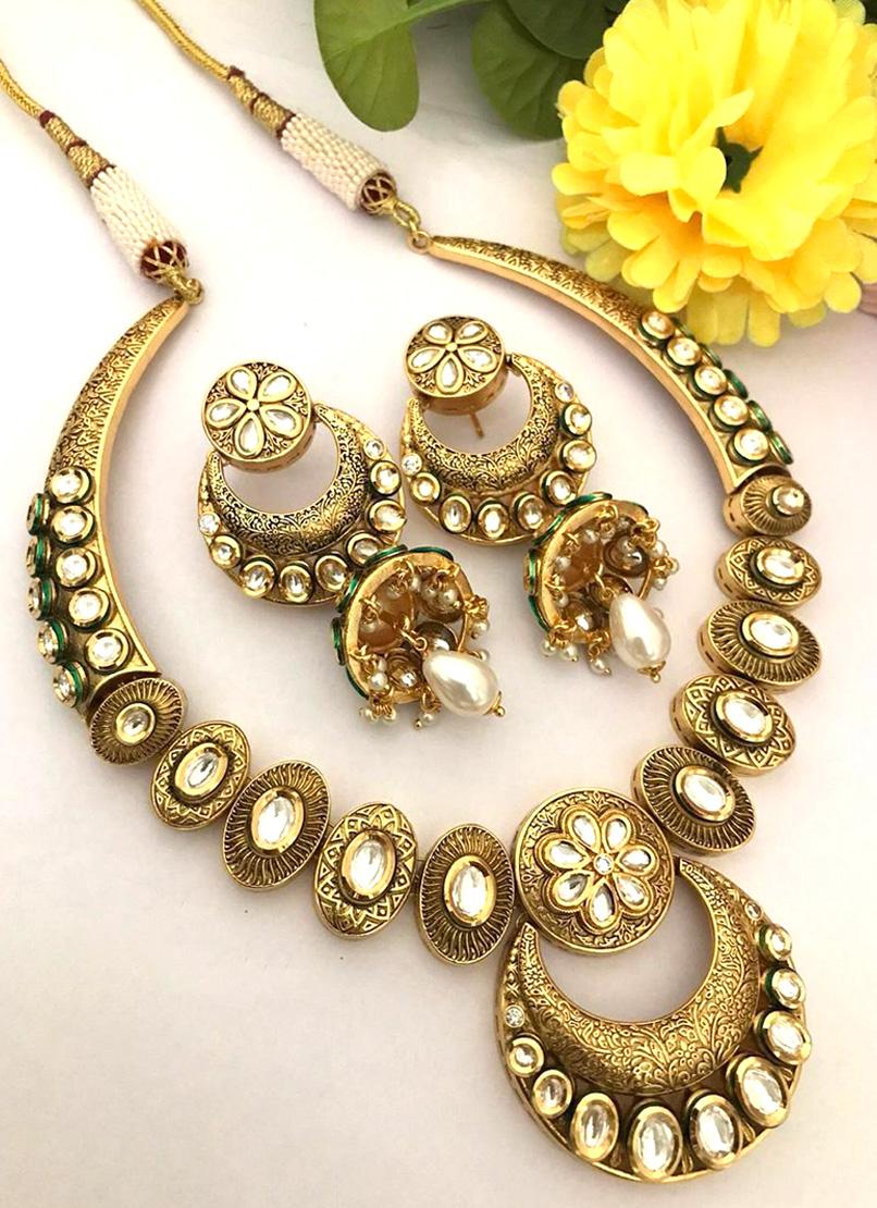 This gold choker necklace features a regal crescent-shaped pendant adorned with oval white gemstones, framed by intricate gold detailing. Matching earrings complete the refined design, accented with pearl-like dangling beads for an elegant traditional touch.