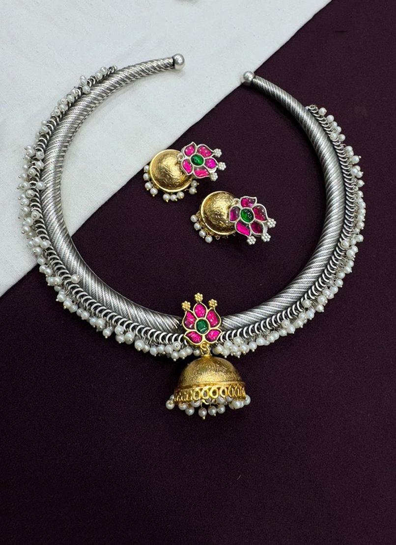 This elegant gold-silver necklace and earrings set features a bell-shaped pendant with white pearls, complemented by pink and green gemstone floral motifs. A refined blend of traditional craftsmanship and intricate detailing makes this a striking statement jewelry piece.