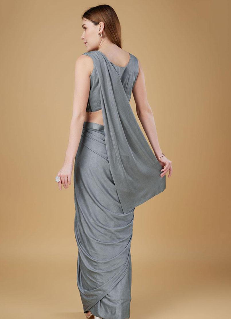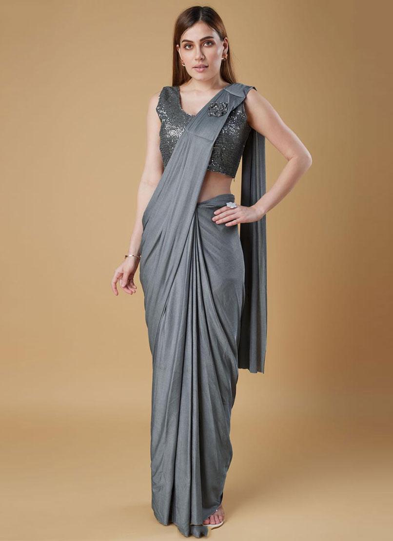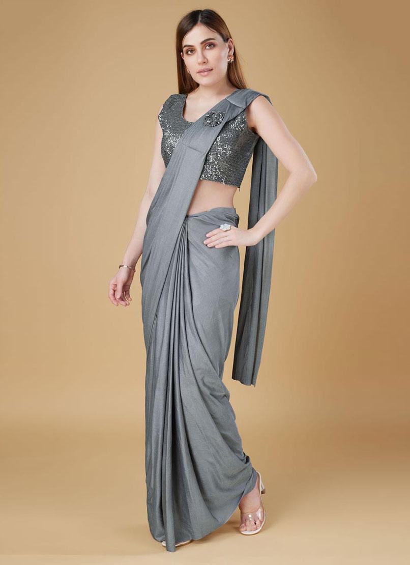 This elegant ready-to-wear designer saree is crafted from imported crush fabric with shimmering sequin embellishments. Paired with a matching blouse, it drapes beautifully and is available in small, medium, and large sizes.