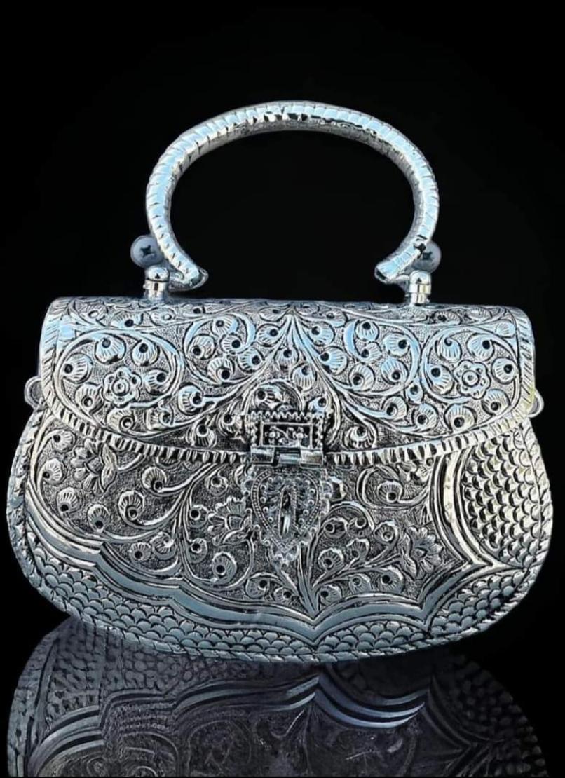 This elegant hand-carved German silver purse, measuring 8 inches by 6 inches, showcases intricate floral and vine patterns with vibrant gemstone accents in green and red. Its textured silver handle and secure clasp design add both style and functionality. Crafted by skilled artisans, this luxurious accessory seamlessly combines traditional artistry with modern utility, making it a perfect choice for special occasions or everyday sophistication.