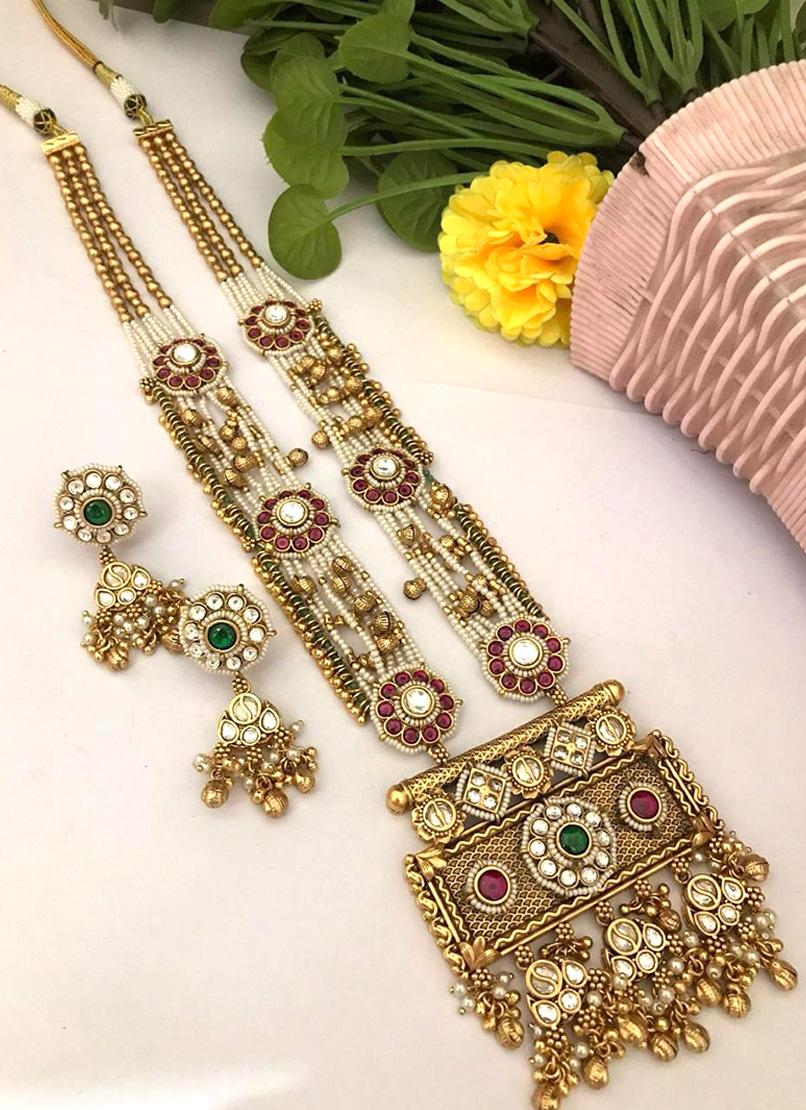 This gold long necklace features two strands of gold beads and white pearls, adorned with intricate detailing and vibrant red and green gemstones. A grand centerpiece with a bold green gemstone enhances its regal appeal, while matching earrings complete the exquisite bridal jewelry set.
