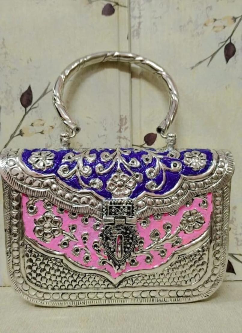 This hand-carved German silver purse, measuring 8"x6", showcases intricate floral and geometric patterns. Crafted from durable German silver, it features a twisted handle and an ornate clasp for added elegance. Its compact yet practical size makes it ideal for carrying essentials, while the timeless design ensures versatility for formal events, casual outings, or as a collector's item.