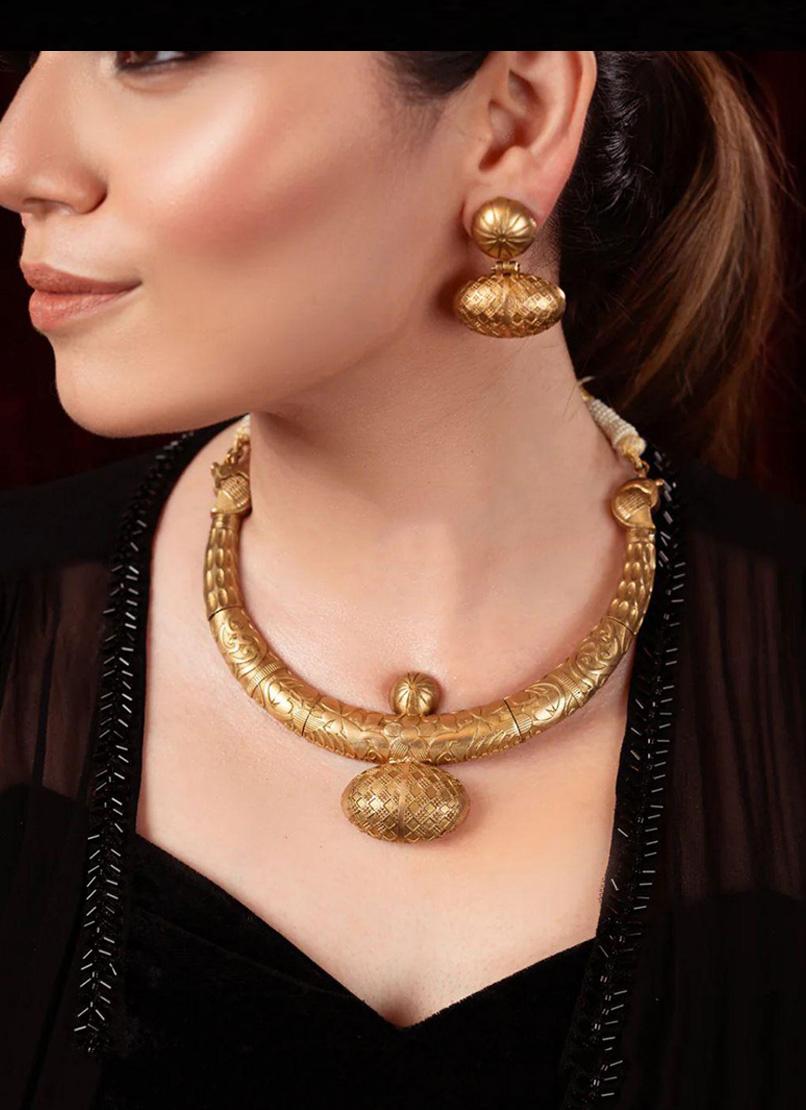 This ornate gold jewelry set features a richly detailed necklace with a circular pendant, adorned with intricate engravings. The matching spherical earrings echo the craftsmanship, making this a stunning statement piece for traditional wear.