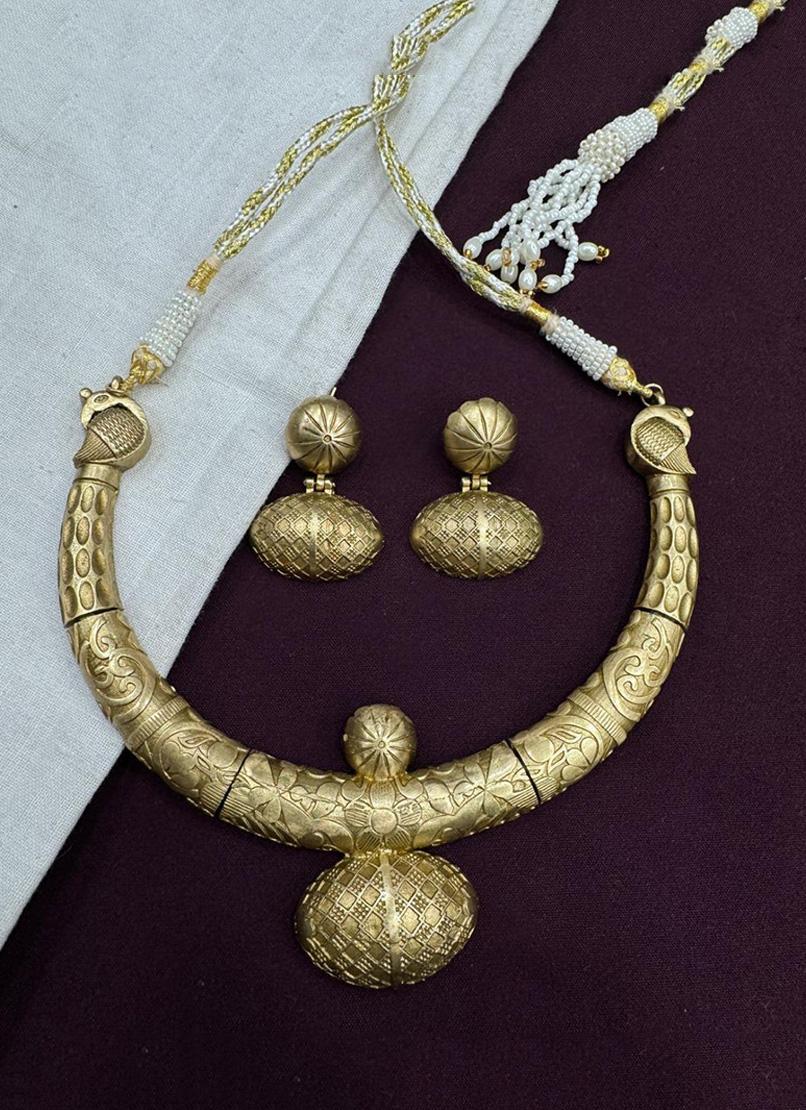 This ornate silver jewelry set features a curved necklace with bird-shaped ends, intricate floral engravings, and a detailed pendant, paired with matching earrings. The rich craftsmanship and traditional aesthetics make it a striking statement piece.