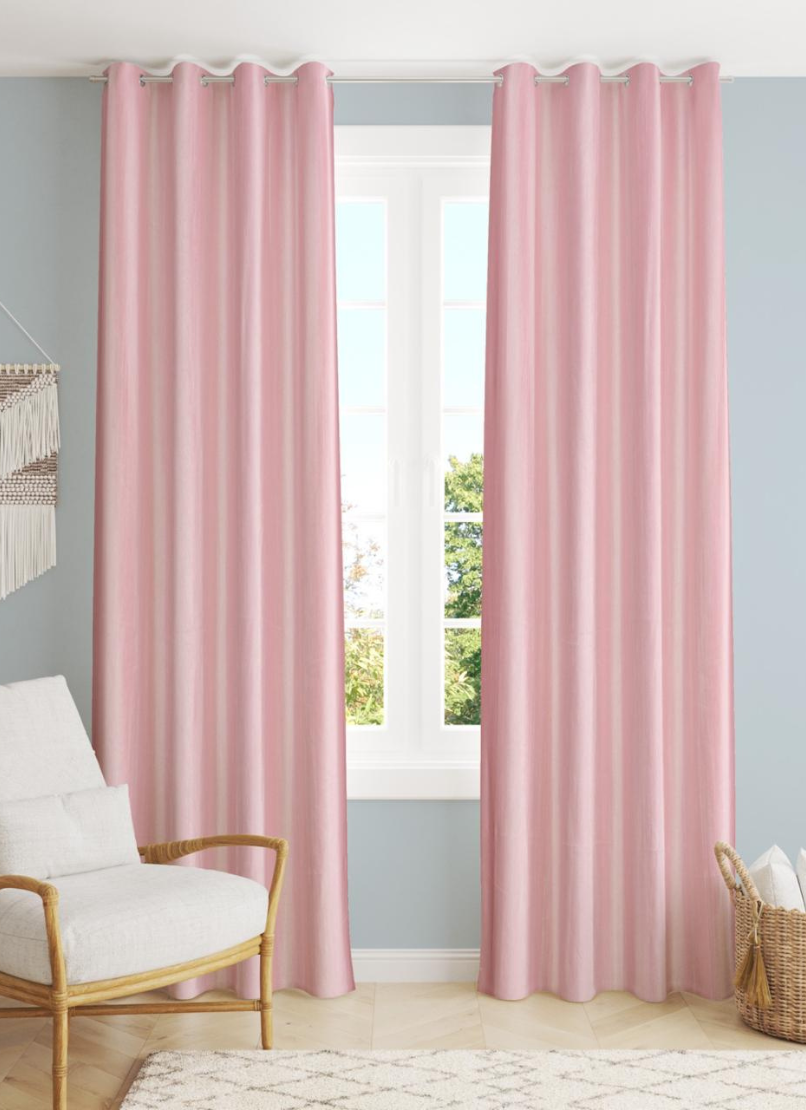 A soft, pastel pink curtain with a smooth texture and slight sheen, available in 7 and 9-foot lengths. Its solid color and minimalist design add elegance, while the 4-foot width ensures ample coverage. Perfect for a relaxing and sophisticated ambiance, it complements various decor styles, enhancing the room's warmth and sophistication.