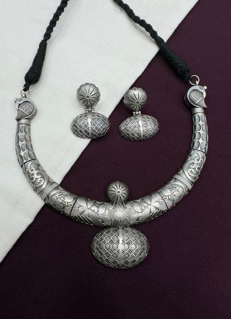 This peacock-inspired silver jewelry set features a majestic necklace with intricately sculpted ends, fine engravings, and an adjustable black braided cord, paired with elegant dangle earrings. A perfect fusion of heritage symbolism and refined craftsmanship.