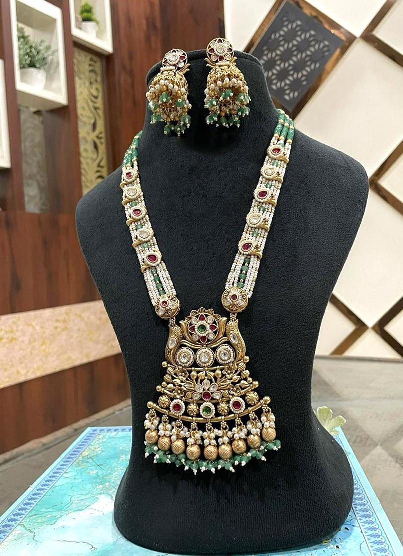 This bridal pearl necklace set features multiple strands of white pearls and green beads, leading to an ornate gold pendant with red, green, and white gemstones. The matching earrings mirror the intricate detailing, making this a perfect traditional statement jewelry piece.