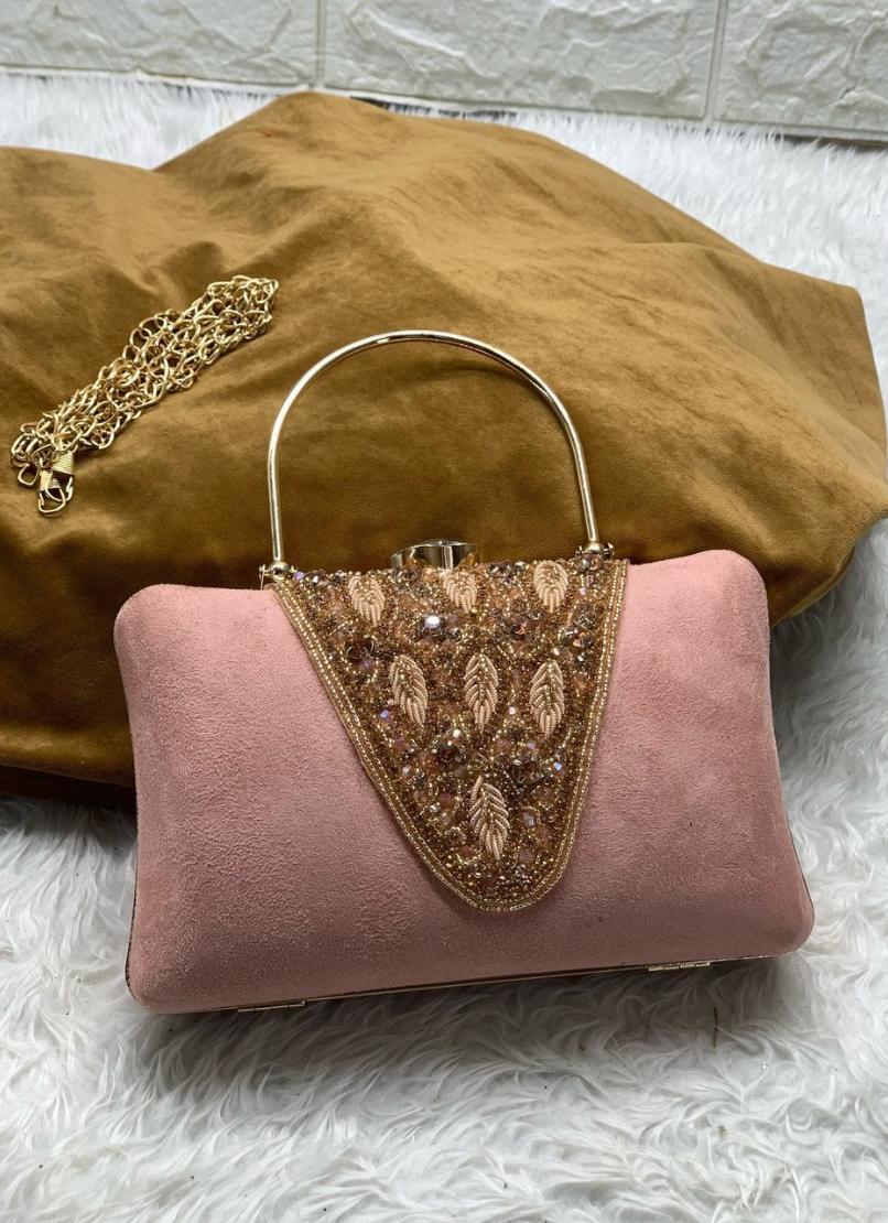 This beautiful velvet clutch sling features intricate Zari handwork and vibrant Pink and gold beadwork in floral motifs. Compact yet functional, it offers a spacious main compartment and an inner pocket, complemented by a stylish clasp closure. With a versatile wrist handle and a long chain strap, this elegant accessory is perfect for festive occasions and adds a touch of luxury to any outfit.