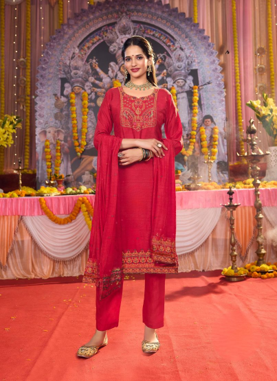 Color & Style: Red embroidered salwar kameez featuring elegant detailing.