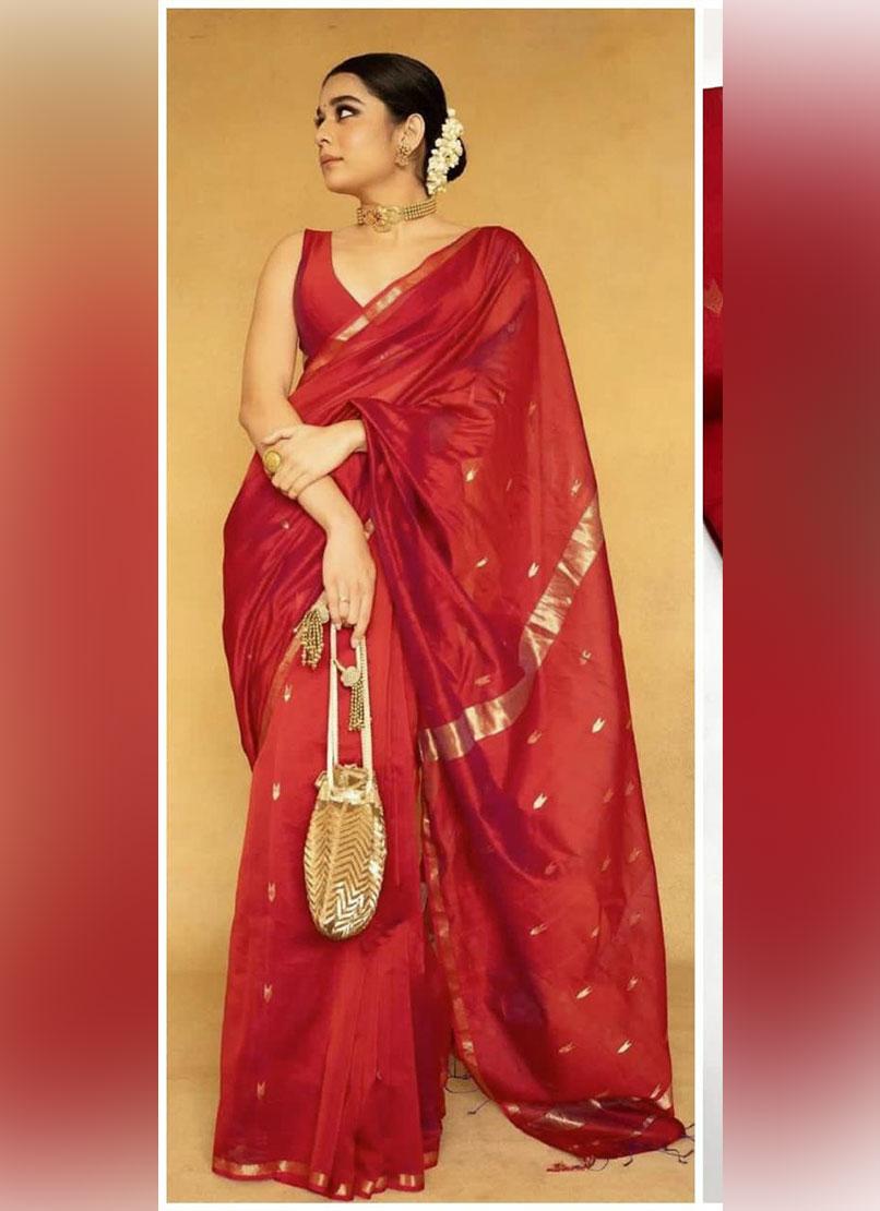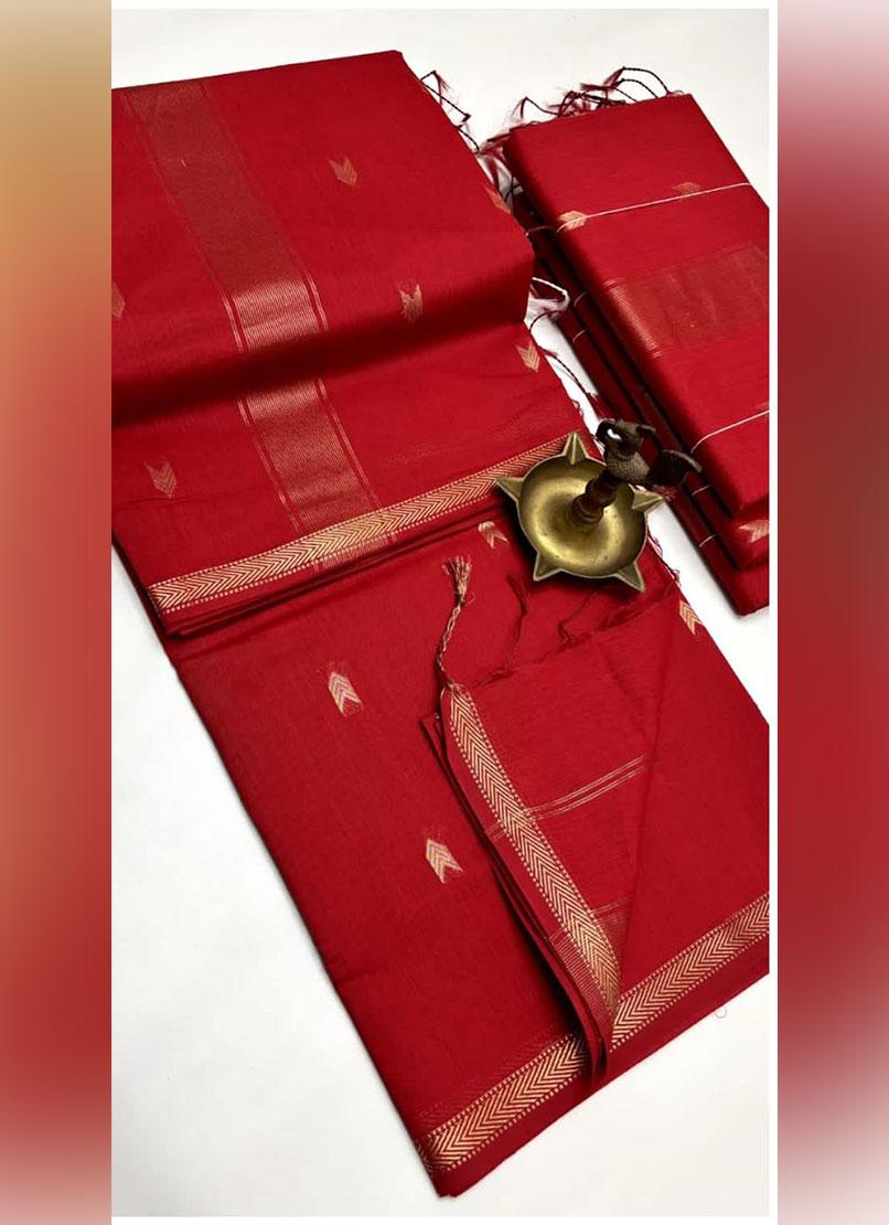 The Maheswari Silk Cotton Saree features a premium silk cotton weave, offering a lightweight yet luxurious feel. Designed with sleek border work on both sides, it is complemented by an attractive contrast pallu and blouse. Delicate motifs are woven across the entire saree, adding to its charm and elegance.