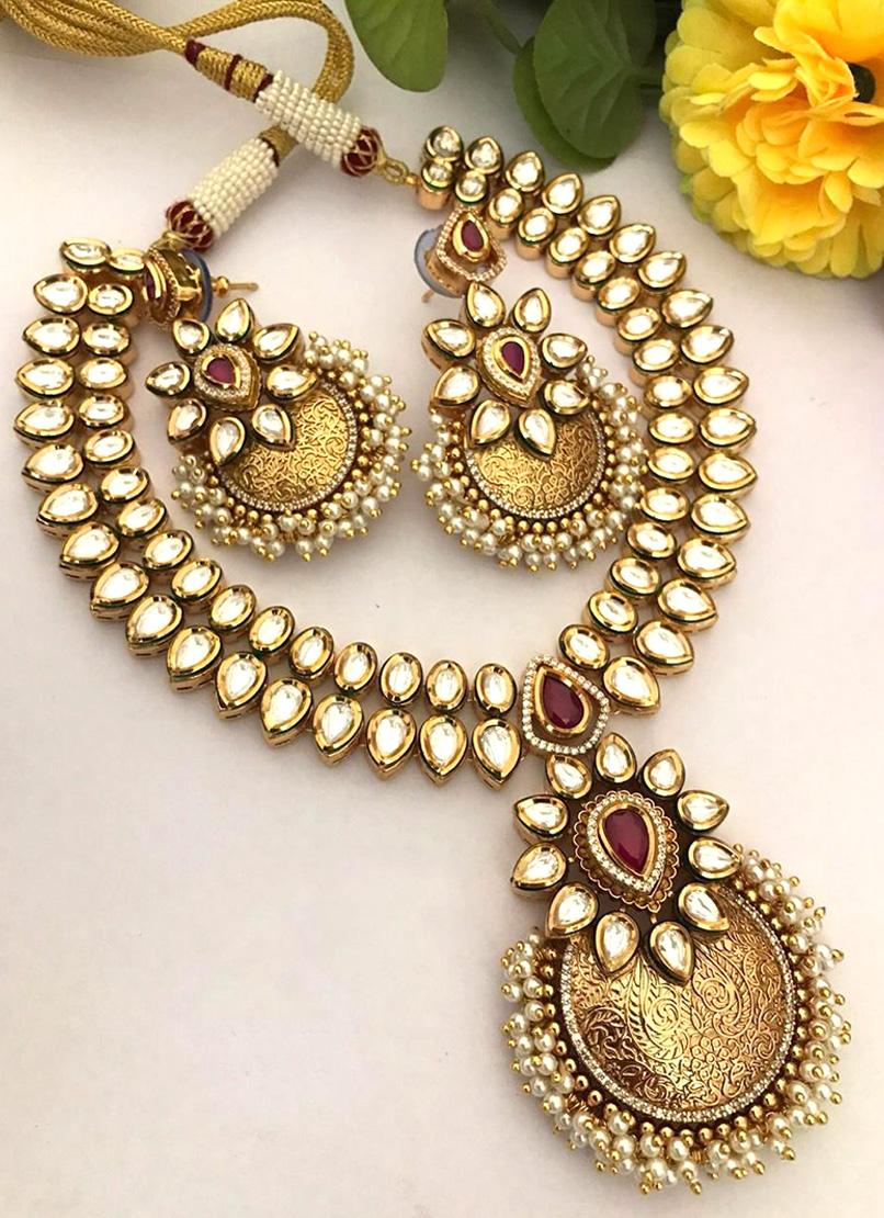 This bridal choker necklace features an intricately designed gold base adorned with symmetrical teardrop-shaped white gemstones and delicate pearl accents. A striking red gemstone crowns the matching earrings, making this an elegant statement set for traditional celebrations.