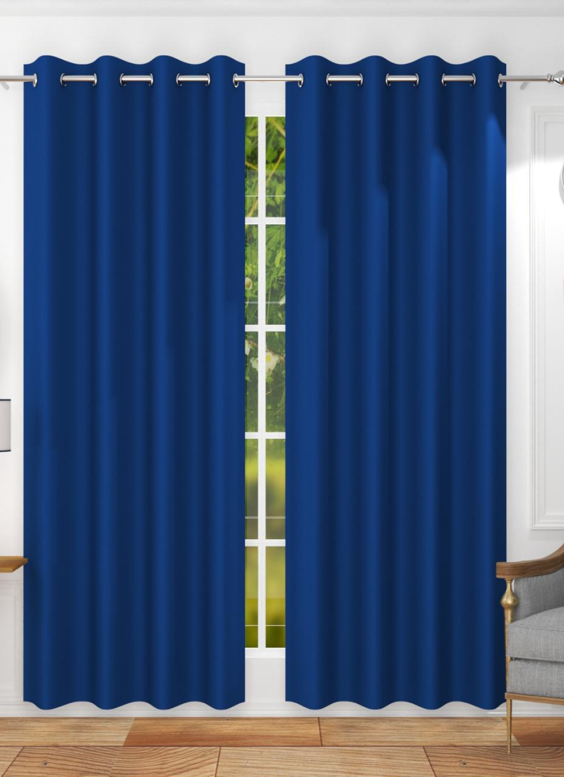 This solid royal blue curtain adds a touch of elegance to your room. It features a grommet top with silver rings for a modern look and is hung on a sleek silver curtain rod. Made of thick, opaque fabric, it provides excellent privacy. The curtain is available in widths of 4ft and lengths of 7ft and 9ft, and its pleated design creates a wavy effect.