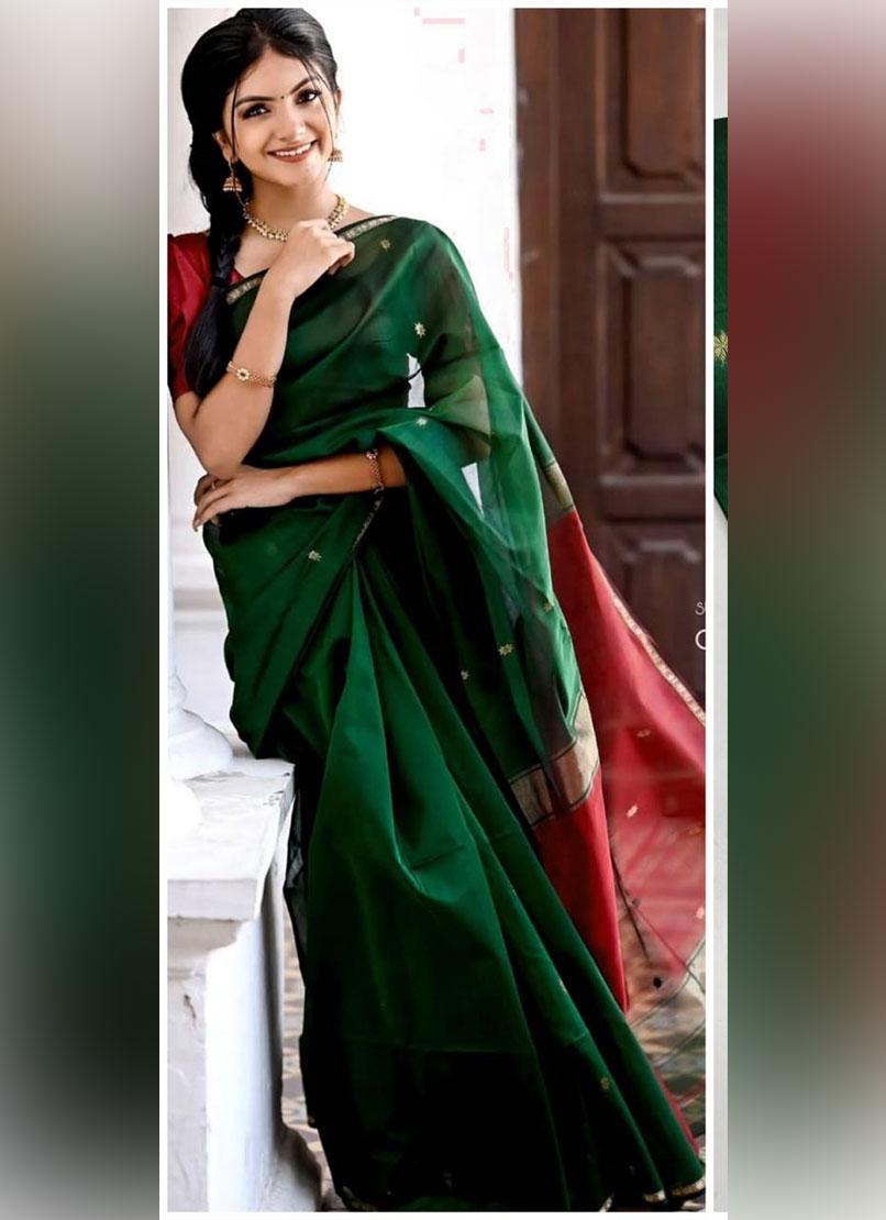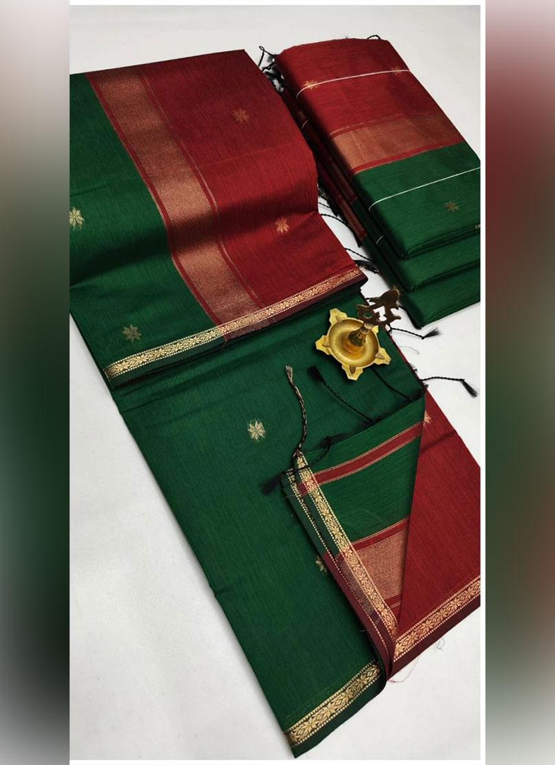 This Green Silk Cotton Saree features a premium lightweight fabric with a sleek red border enhanced by golden accents. The contrast red pallu and blouse add to its graceful charm, while delicate golden motifs complete its refined appeal. A perfect combination of tradition and modern elegance.