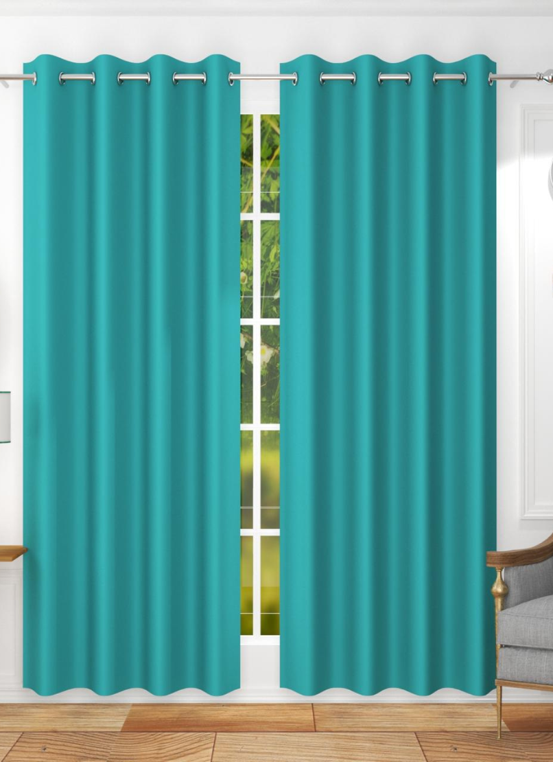 This vibrant turquoise curtain, made from thick, opaque fabric, ensures excellent light-blocking and privacy. Featuring a solid color with a smooth texture, it is available in two sizes: 4ft x 7ft and 4ft x 9ft. The curtain comes with silver grommets and a sleek silver rod with decorative finials, complemented by wave-like pleats for an elegant look.