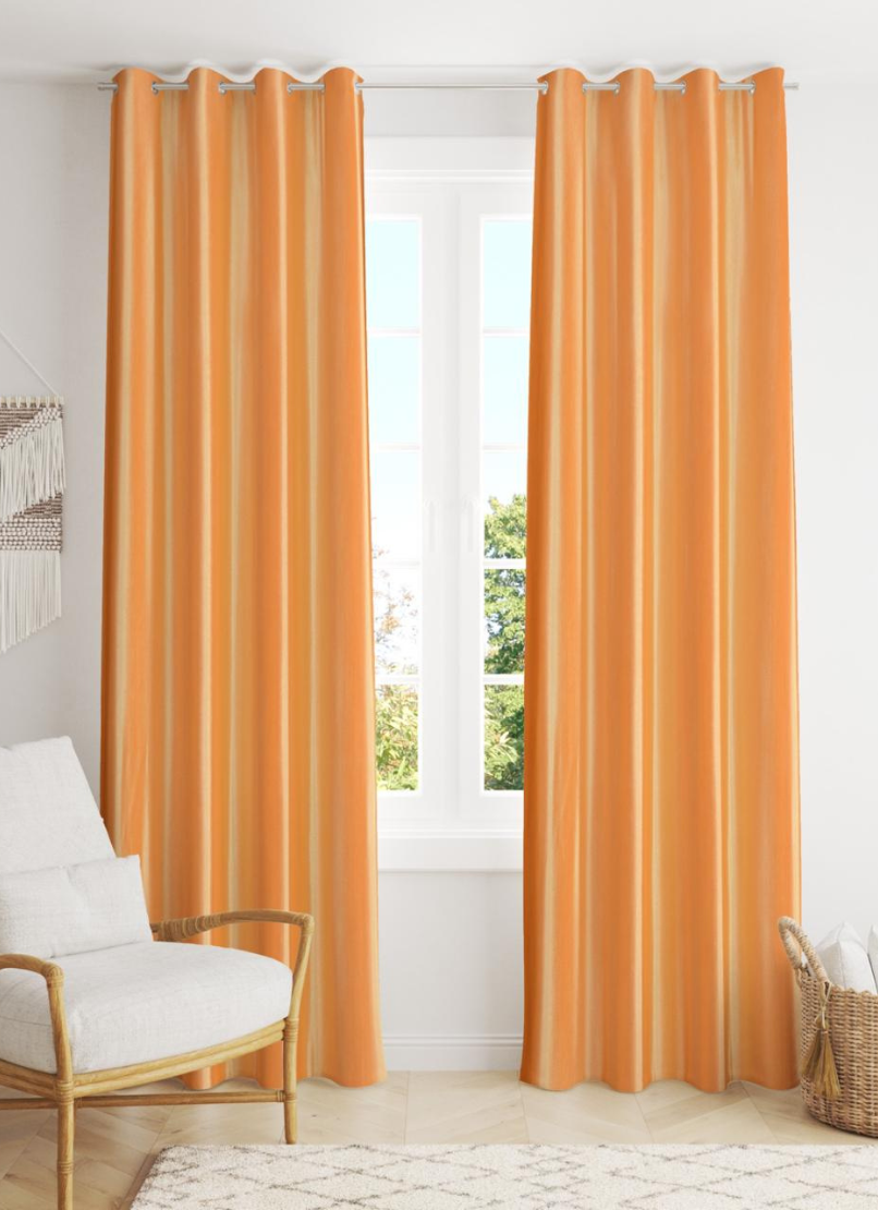 The curtain is vibrant orange with a smooth texture, hanging on a silver rod with grommets. It's floor-length and complements the room's cozy decor, which includes a wicker chair with a white cushion, a woven wall hanging, and a wicker basket with pillows. Positioned in front of a window with a view of lush greenery, the curtain enhances the room's warm and inviting ambiance.