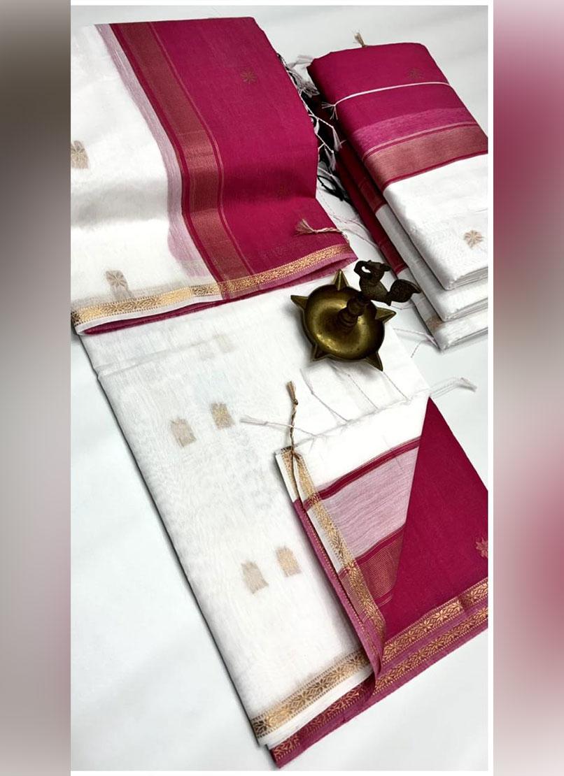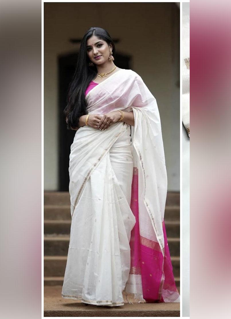 This White Silk Cotton Saree features a luxurious lightweight fabric with a sleek pink border enhanced by golden accents. The contrast pink pallu and blouse add to its elegant charm, while delicate golden motifs complete its refined appeal. A perfect blend of tradition and modern aesthetics.